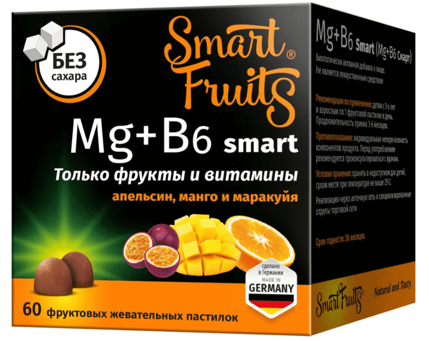 SMART FRUITS MG+B6 СМАРТ - Биологически активная добавка (БАД) к пище - дополнительный источник витамина В6 и магния со вкусом апельсина, манго и маракуйи